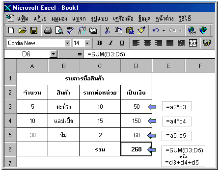 จะเห็นว่า จากรายการซื้อสิ้นค้านี้ถ้าเปลี่ยนแปลงจำนวนมะม่วงไปจาก 5 ผล เป็น 8 ผล ข้อมูลตัวเลขบนตารางจะเปลี่ยนไป ดังนั้นเราจะใช้ตัวแปรแทน ลองดูจากตัวอย่าง