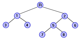 เริ่มจากรูท หรือ R ซึ่งเป็นจุด แรกของต้นไม้ การค้นหาทางลึก จะลงไปทางกิ่งทางซ้ายก่อน นั่นคือ ลงไปที่ 1, 3, 4, 2, 5, 7, 8, 6 |