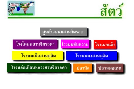 สัตว์ : ปลาหมอเทศ | ปลานิล | ศูนย์รวมนมสวนจิตรลดา | โรงโคนมสวนจิตรลดา | โรงนมเม็ดสวนดุสิต | โรงนมผงสวนดุสิต | โรงหล่อเทียนหลวงสวนจิตรลดา | โรงนมข้นหวาน | โรงเนยแข็ง