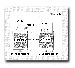 การหมักเพื่อผลิตแก๊สชีวภาพทำได้โดยใช้สิ่งปฏิกูลพวกอินทรีย์วัตถุที่เกิดขึ้นภายในครัวเรือน นำมาหมักลงในบ่อหมักที่จัดเตรียมไว้ และใช้ถังก้นตันคว่ำครอบสิ่งปฏิกูลในบ่อมักไว้ เมื่อแก๊สชีวภาพเกิดขึ้นก็จะถูกรวบรวมไว้ในถังนั้น ทำให้ถังแก๊สลอยตัวสูงขึ้น แก๊สที่ได้นั้นเป็นแก๊สชีวภาพที่นำไปใช้เป็นเชื้อเพลิงได้ทันที
