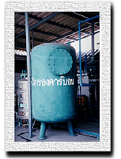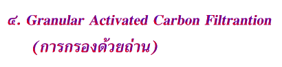 ถังกรองคาร์บอนมีเส้นผ่าศูนย์กลาง ๑.๒๐ เมตร สูง ๑.๕๐ เมตรการกรองด้วยถ่านใช้ถ่านกัมมันต์ Granular activated carbon(GAC) เป็นการกรองเพื่อกำจัดอินทรีย์ (organics) กลิ่น รส และสี มี Empty-Bed Contact Time (EBCT) ประมาณ ๔๐ นาที ที่จำเป็นต้องใช้เวลากรองนานเพื่อให้ Adsorption ของสารอินทรีย์ในน้ำเสียดียิ่งขึ้น