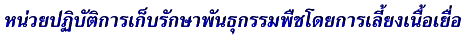 เก็บรักษาพันธุ์พืชในสภาพปลอดเชื้อ จัดทำประวัติพันธุ์พืชที่เก็บ ศึกษาวิธีการชักนำให้เป็นต้นที่สมบูรณ์หลังจากการเก็บรักษา ศึกษาความเปลี่ยนแปลงก่อนเก็บรักษา และหลังการเก็บรักษา
