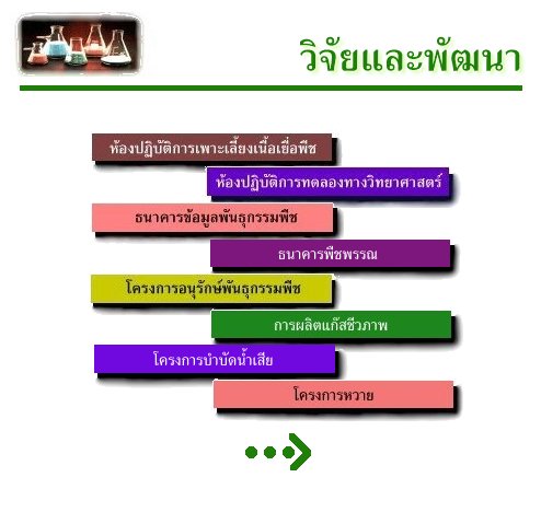 วิจัยและพัฒนา : ห้องปฎิบัติการเพาะเลี้ยงเนื้อเยื่อพืช | ห้องปฎิบัติการทดลองทางวิทยาศาสตร์ | ธนาคารข้อมูลพันธุกรรมพืช | ธนาคารพืชพรรณ | โครงการอนุรักษ์พันธุกรรมพืช | การผลิตแก๊สชีวภาพ | โครงการบำบัดน้ำเสีย | โครงการหวาย [มีต่อ...]