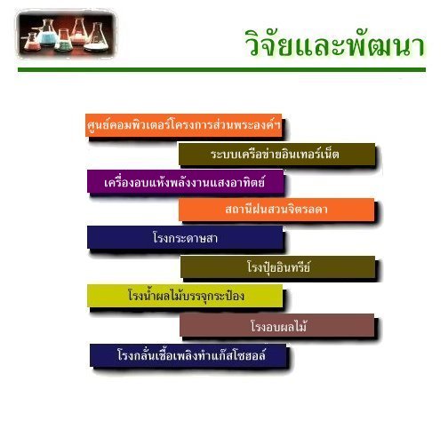 วิจัยและพัฒนา : ศูนย์คอมพิวเตอร์โครงการส่วนพระองค์ฯ | ระบบเครือข่ายอินเทอร์เน็ต | เครื่องอบแห้งพลังงานแสงอาทิตย์ | โรงกระดาษสา | โรงปุ๋ยอินทรีย์ | โรงน้ำผลไม้บรรจุกระป๋อง | โรงอบผลไม้ | โรงกลั่นเชื้อเพลิงทำแก๊สโซฮอล์ | [หน้าที่แล้ว]