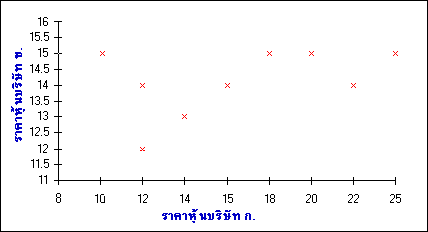 การเปรียบเทียบกันระหว่างเดือนของแต่ละบริษัทจึงใช้วิธีการเขียนกราฟแบบ scatter ซึ่งให้แกน x แทนราคาหุ้นของบริษัท ก และแกน y แทนราคาหุ้นของบริษัท ข จุดที่เขียนได้จึงเป็นจุดที่เป็นคู่ลำดับของราคาหุ้นบริษัท ก และราคาหุ้นของบริษัท ข ซึ่งทุกจุดจึงเป็นสิ่งที่จะเปรียบเทียบกันได้
